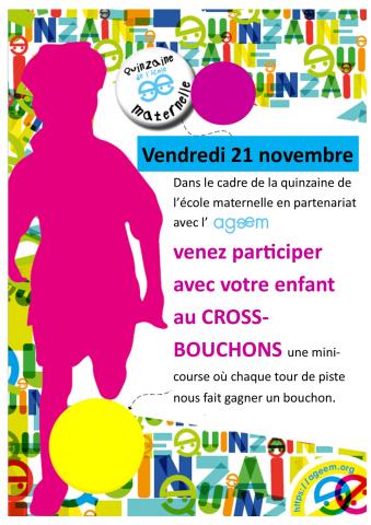 Dans le cadre de la quinzaine de l’école maternelle, l’AGEEM (Association Générale de Enseignants de l’Ecole Maternelle publique dont nous sommes toutes les 2 enseignantes adhérentes) nous organisons un moment de partage avec les parents sous la forme d’un « CROSS-BOUCHONS ».